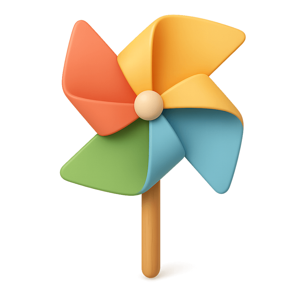 A pinwheel is a lightweight toy that spins when blown by the wind or by breath. It typically consists of a stick with a wheel of paper or plastic vanes attached, providing visual delight and entertainment, especially for children.