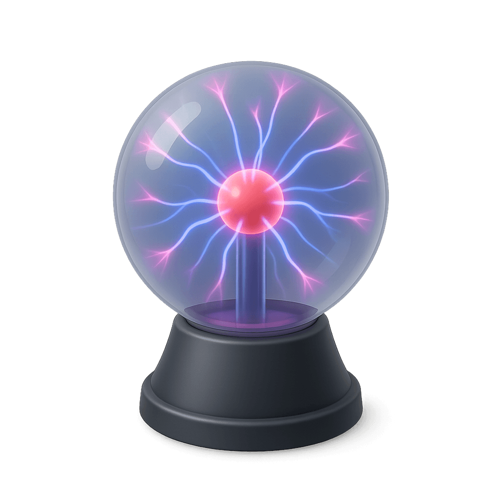 A plasma globe is a decorative glass sphere filled with inert gases that displays colorful streams of plasma when powered. Touching the globe causes the plasma filaments to follow your fingers, making it a popular science demonstration and novelty item.