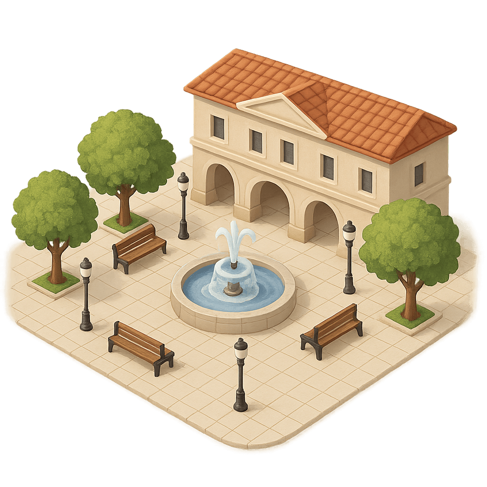 A plaza is a large open public space, often found in the heart of a city or town, typically surrounded by buildings and used for community gatherings, markets, celebrations, and social activities. Plazas are central features in urban planning and serve as important social and cultural hubs.