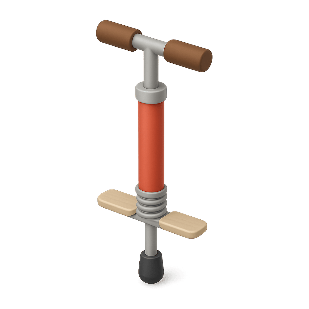 A pogo stick is a spring-loaded device used for jumping and performing tricks, popular as a recreational toy and exercise equipment. Riders bounce by pushing off the ground with their feet while balancing on the stick.