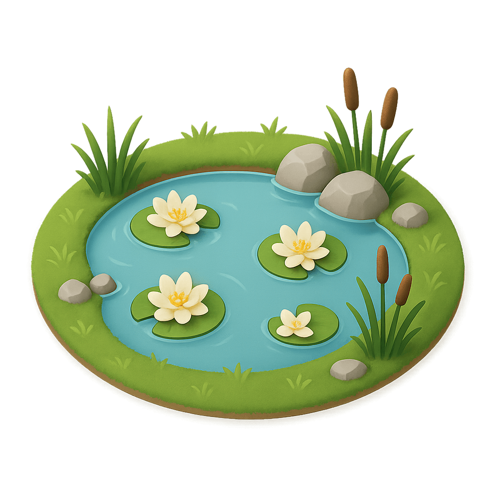 A small, natural or artificial body of still water, often found in parks, gardens, or rural landscapes. Ponds support a variety of plant and animal life and are important for local ecosystems.