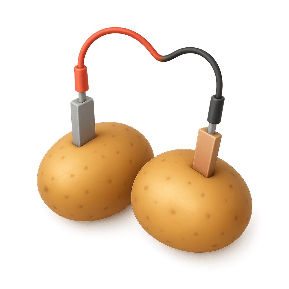 A simple science experiment that generates electricity using potatoes, metal electrodes, and wires. Commonly used as an educational project to demonstrate basic principles of chemistry and electricity.