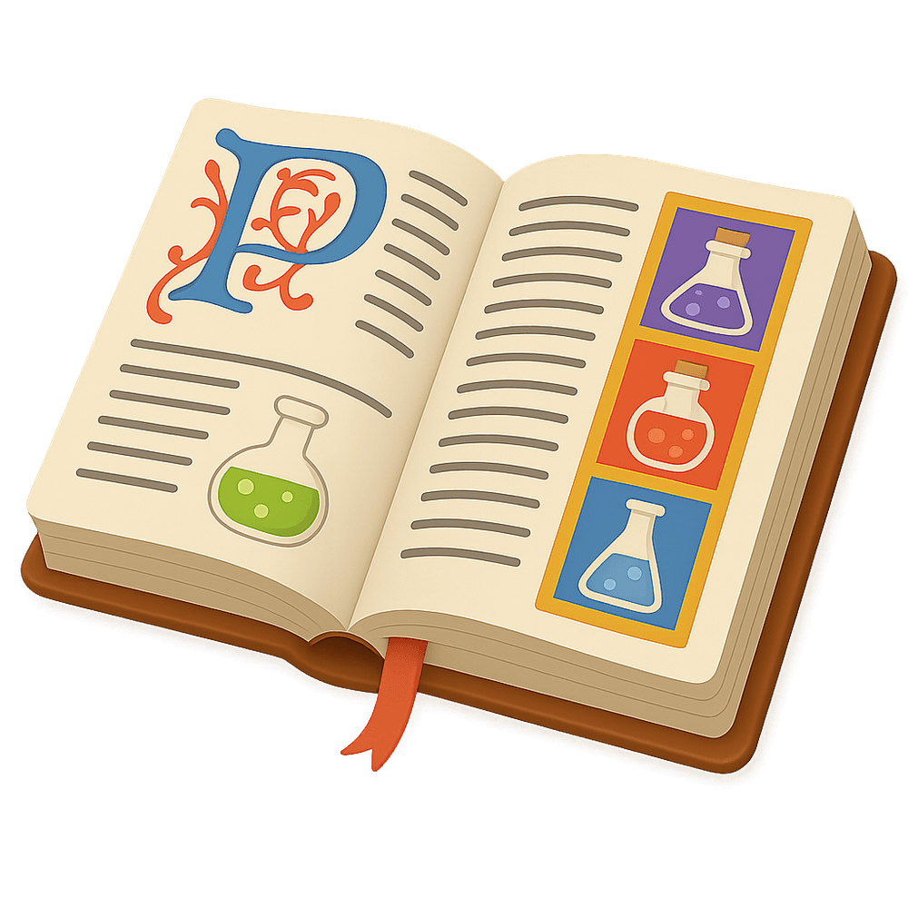 A Potions Book is a magical tome filled with recipes, instructions, and secrets for brewing mystical potions. Often used by wizards, witches, and alchemists, it serves as a guide to creating elixirs, antidotes, and magical mixtures in fantasy worlds.