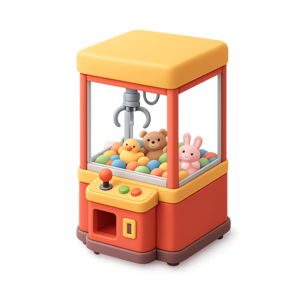 A prize claw is an arcade game machine where players control a mechanical claw to try to grab and win prizes, such as toys or candy, by maneuvering the claw over a pile of items and attempting to pick one up.