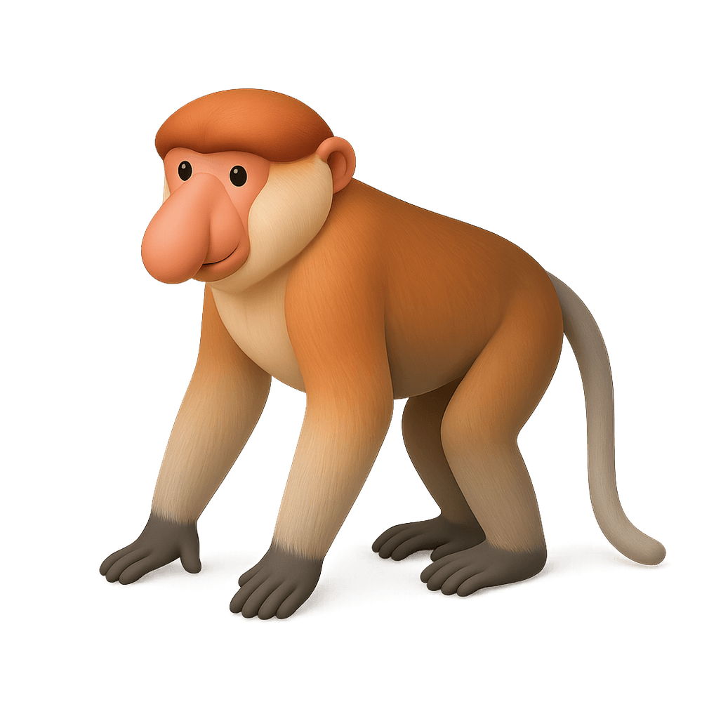 The proboscis monkey is a large, distinctive primate native to the rainforests of Borneo, known for its unusually long nose and reddish-brown fur. It is an arboreal, social animal that lives in groups near rivers and mangroves, and is classified as endangered due to habitat loss.