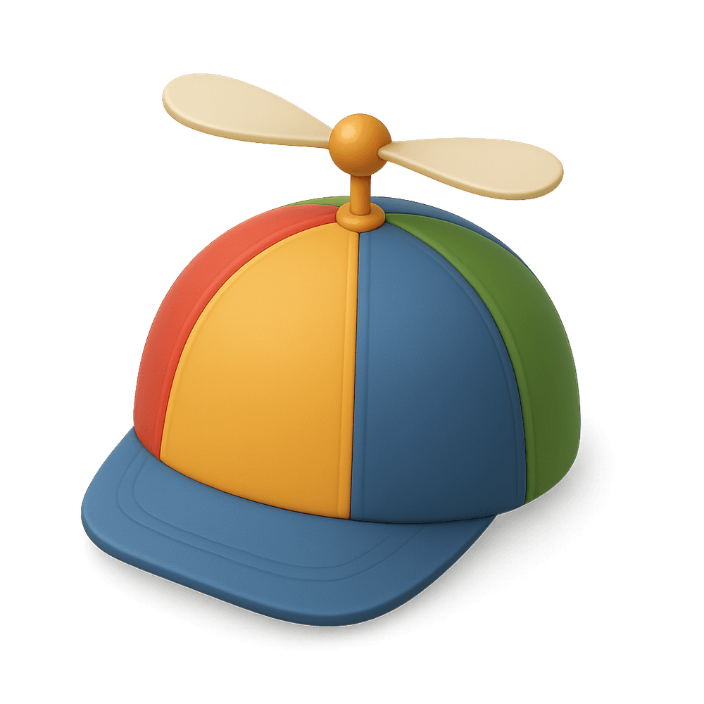 A whimsical hat featuring a small spinning propeller on top, often associated with playful or humorous fashion. Popular as a novelty accessory and in retro or costume styles.