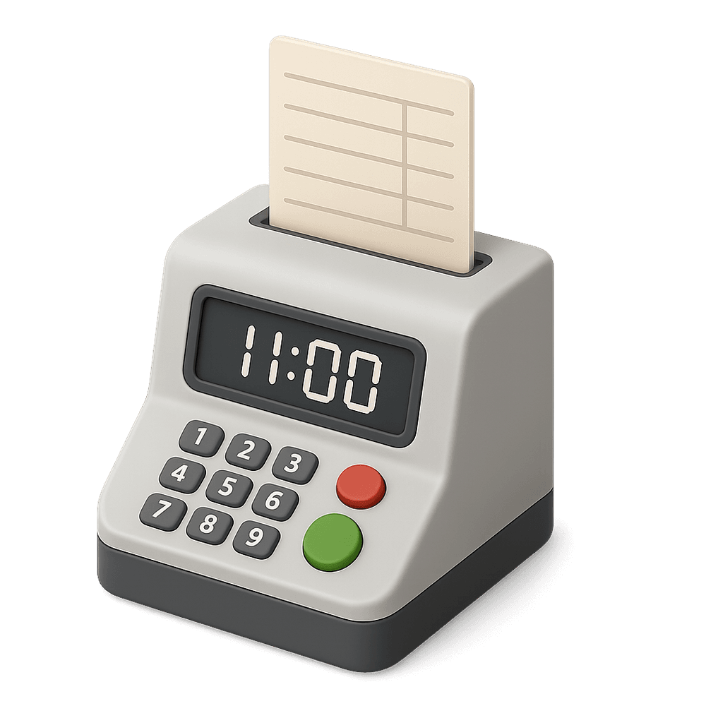 A punch clock is a mechanical or electronic device used by employees to record their working hours by 'punching in' and 'punching out.' Commonly found in workplaces, it helps track attendance and calculate payroll.
