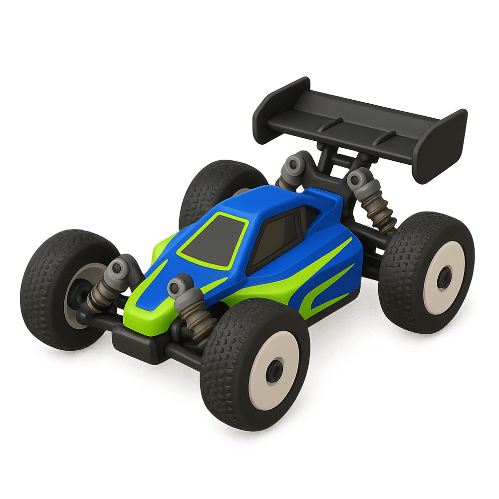 A remote-controlled (RC) buggy is a small, off-road vehicle model operated by a handheld transmitter. Popular among hobbyists, it is designed for speed, agility, and rugged terrain, making it ideal for racing and outdoor play.