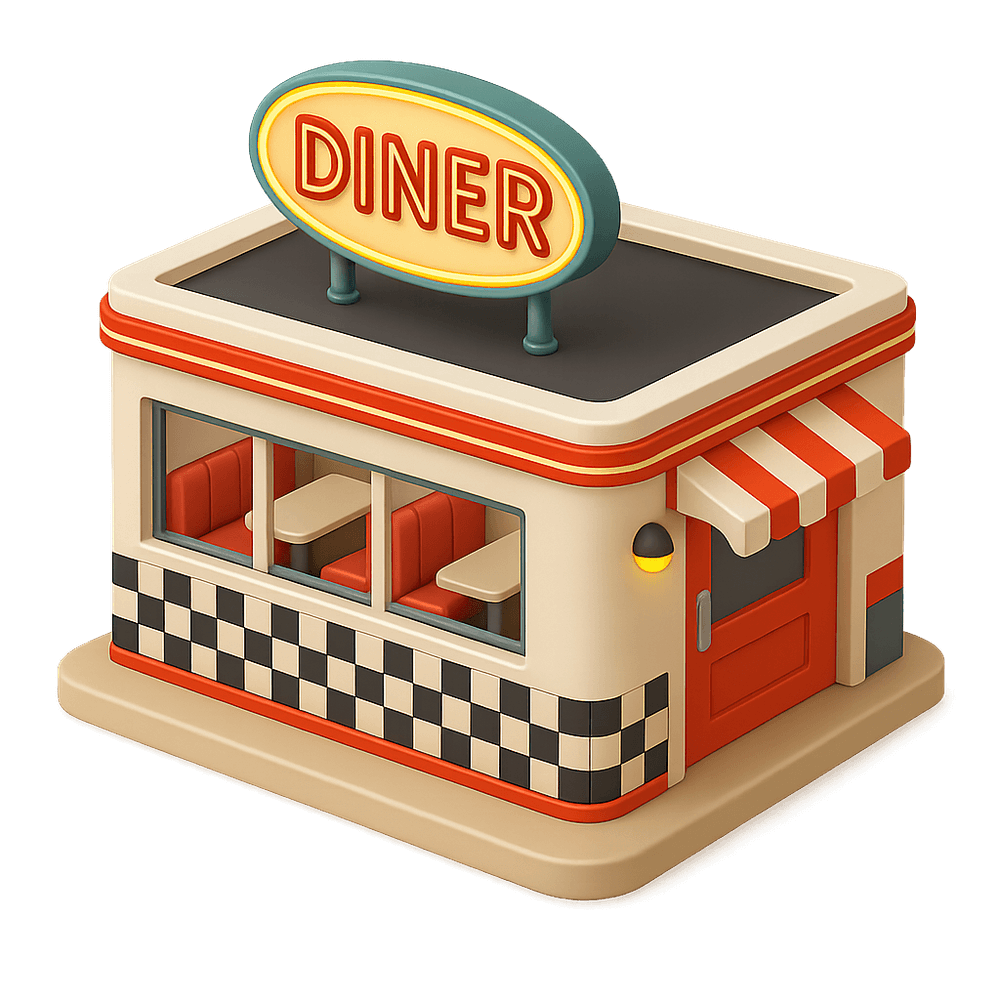 A Retro Diner is a nostalgic eatery styled after mid-20th-century American diners, featuring classic decor, neon lights, checkered floors, and vintage booths. Known for serving comfort foods like burgers, milkshakes, and fries, it offers a lively, social atmosphere reminiscent of the 1950s and 60s.