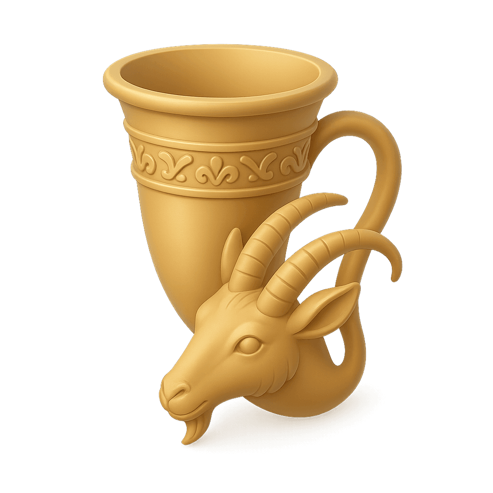 A rhyton is an ancient ceremonial drinking vessel, often shaped like an animal or mythological creature, used in rituals and feasts across various cultures, especially in Persia and Greece.
