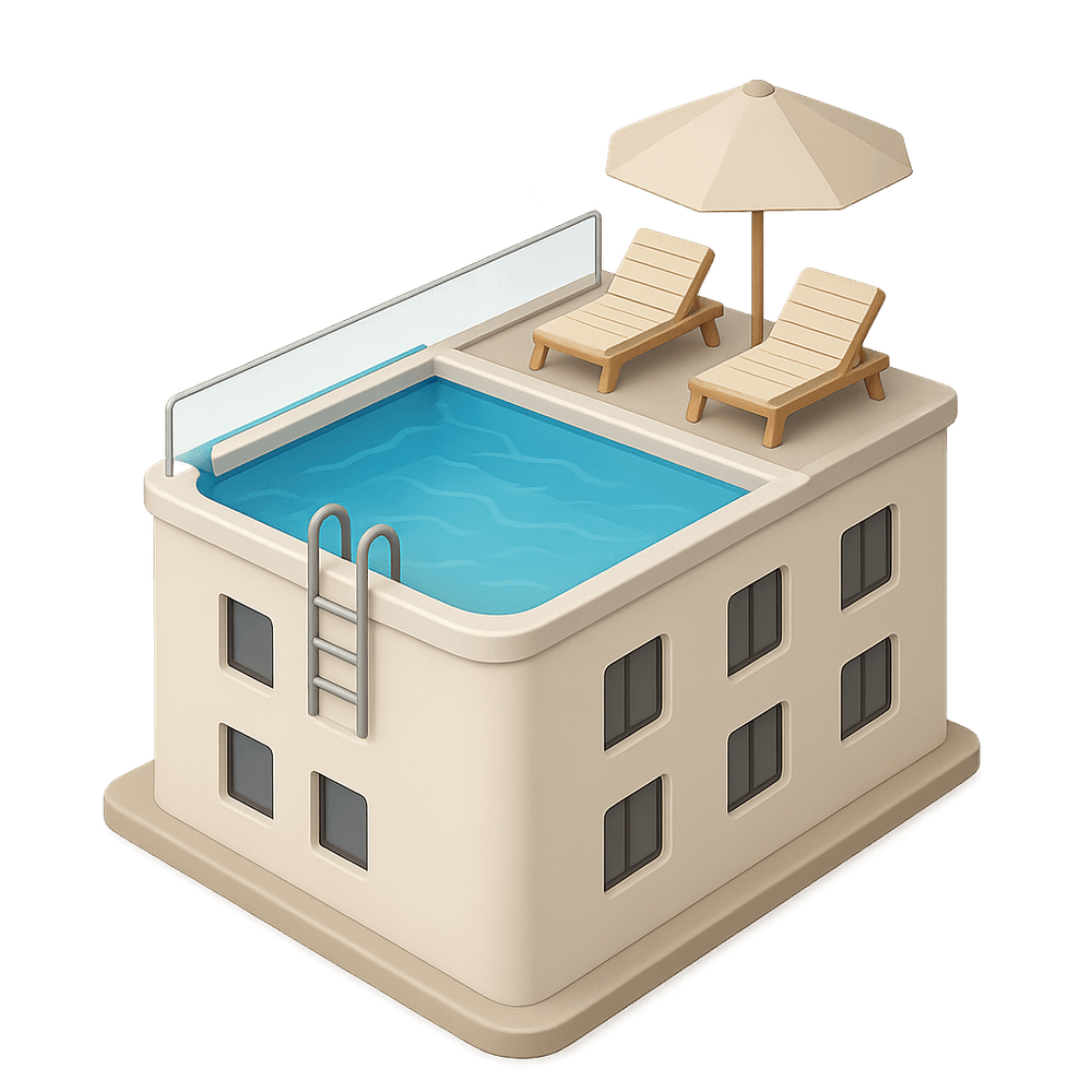 A luxurious swimming pool located on the rooftop of a building, designed with a vanishing edge that creates the illusion of water extending to the horizon. Often found in upscale hotels or residential complexes, it offers stunning city or scenic views and a unique leisure experience.