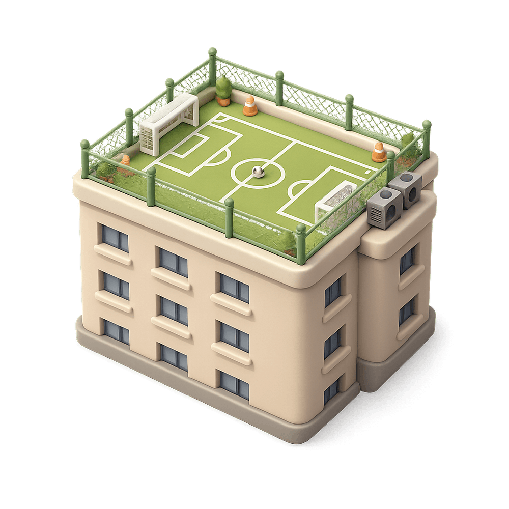 A sports field designed for playing soccer, located on the rooftop of a building. These unique urban spaces maximize limited city real estate and offer recreational opportunities with scenic views.