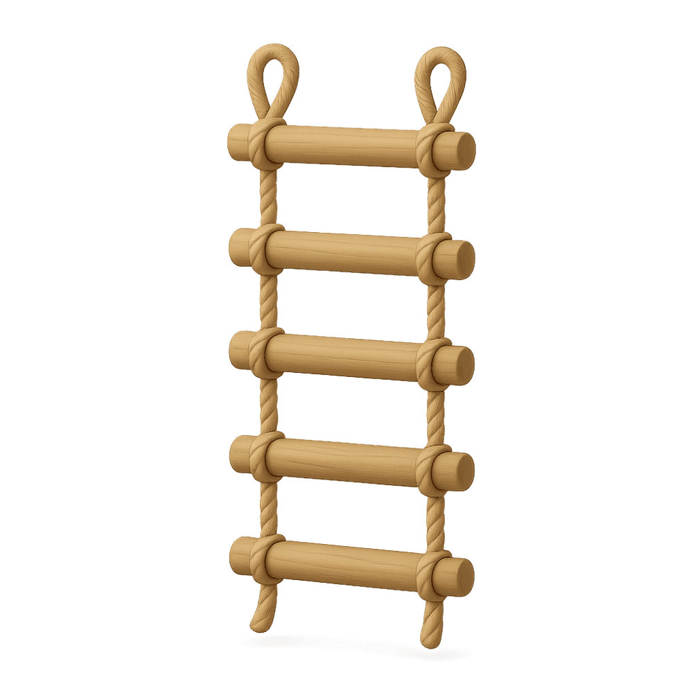 A rope ladder is a portable, flexible ladder made of ropes and wooden or plastic rungs. It is commonly used for climbing, outdoor activities, and adventure hobbies such as camping, tree climbing, or obstacle courses.