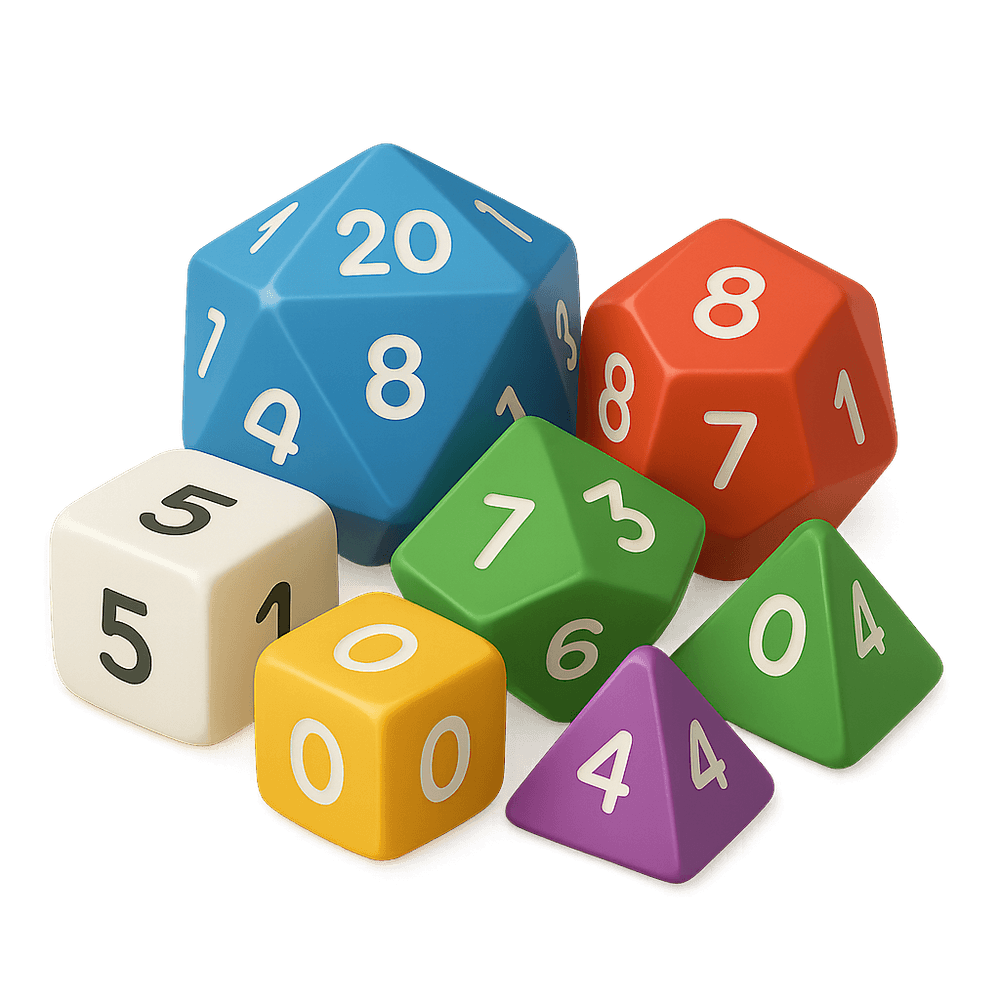 A set of polyhedral dice used in tabletop role-playing games (RPGs) for generating random numbers and outcomes. Essential for games like Dungeons & Dragons, these dice come in various shapes and are a staple for gaming sessions.