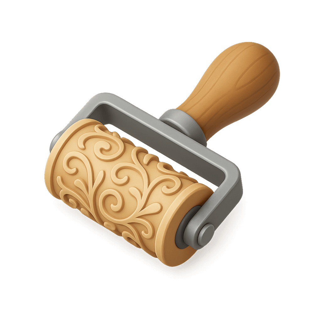 A rubber stamp roller is a crafting tool featuring a rotating rubber surface with engraved patterns or designs. It is rolled over ink and then onto paper or other surfaces to create continuous decorative borders or backgrounds, making it popular for scrapbooking, card making, and other creative hobbies.