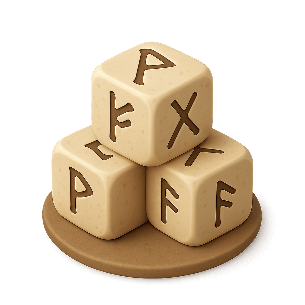 Rune Dice are mystical dice inscribed with ancient runes, often used in fantasy settings for divination, magical games, or storytelling. Each face bears a unique symbol, believed to hold magical power or reveal hidden truths.
