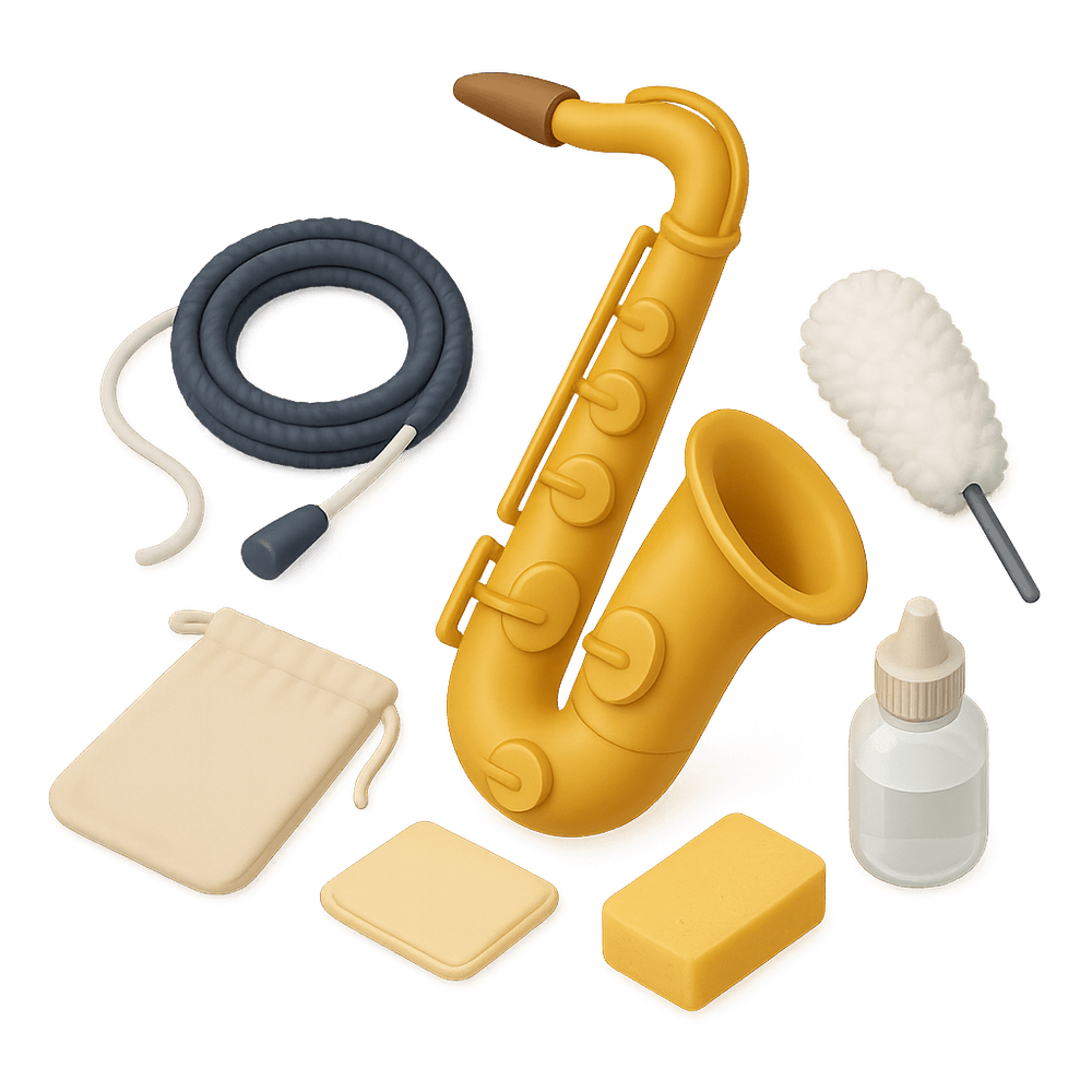 A saxophone cleaning kit is a set of specialized tools and cleaning solutions designed to maintain and prolong the life of a saxophone. It typically includes brushes, cloths, and swabs to remove moisture, dust, and residue from the instrument, ensuring optimal sound quality and hygiene.