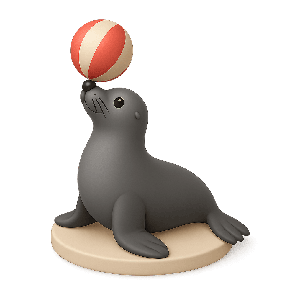 A playful act where a seal balances a ball on its nose, often seen in circuses or marine shows. This entertaining trick showcases the seal's intelligence and agility, delighting audiences of all ages.