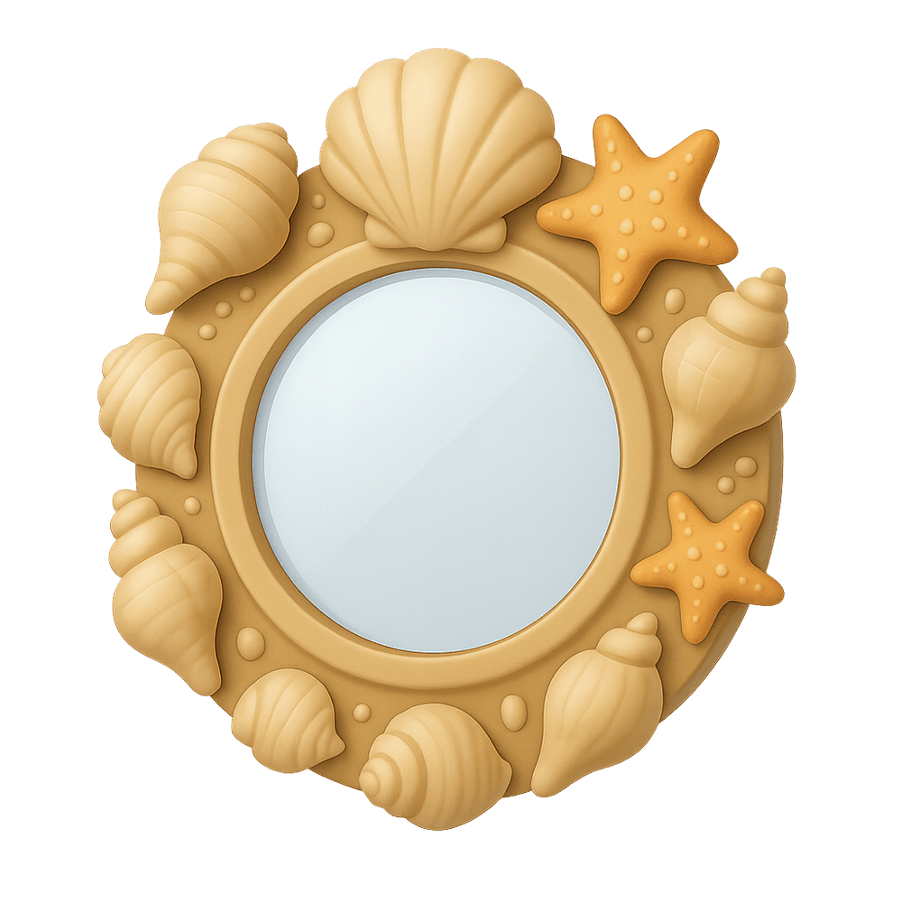 A decorative mirror adorned with real or imitation seashells, often handcrafted as a creative hobby project. Adds a coastal or beach-inspired touch to home decor.