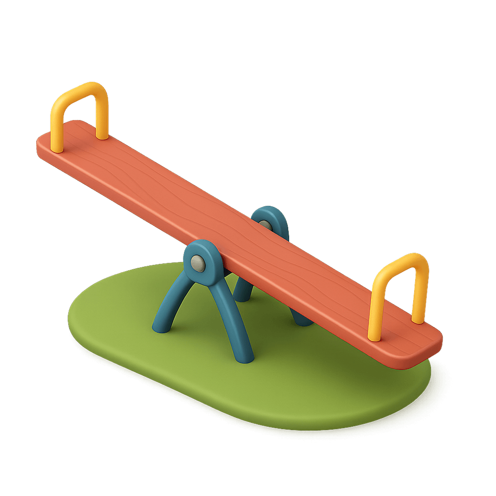 A seesaw is a long, narrow board balanced in the center, allowing two people to sit on either end and move up and down by pushing off the ground. Commonly found in playgrounds, it provides fun and physical activity for children.