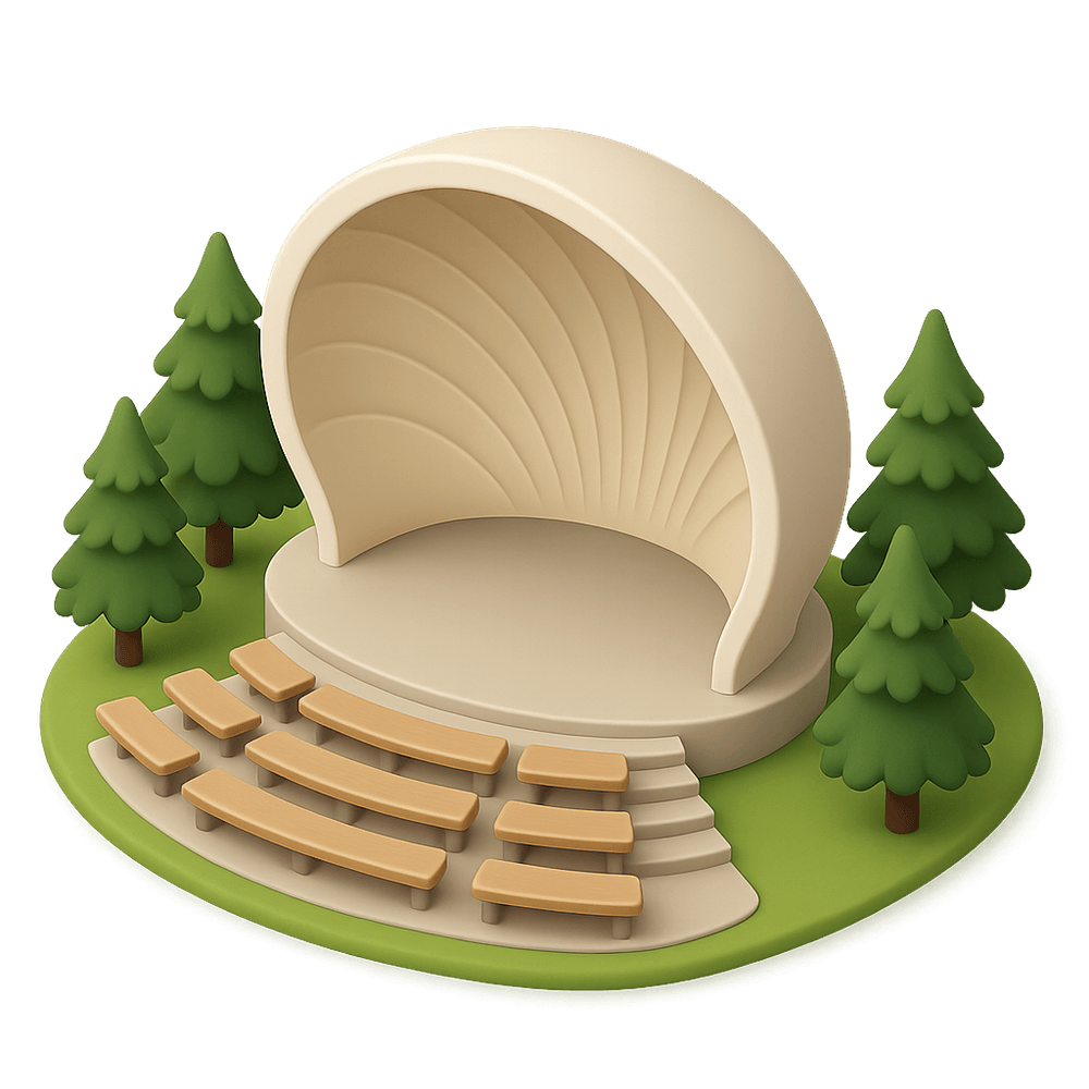 An outdoor performance venue designed in the shape of a shell, often used for concerts, theater, and public gatherings. Its unique curved structure enhances acoustics and provides a visually striking landmark.