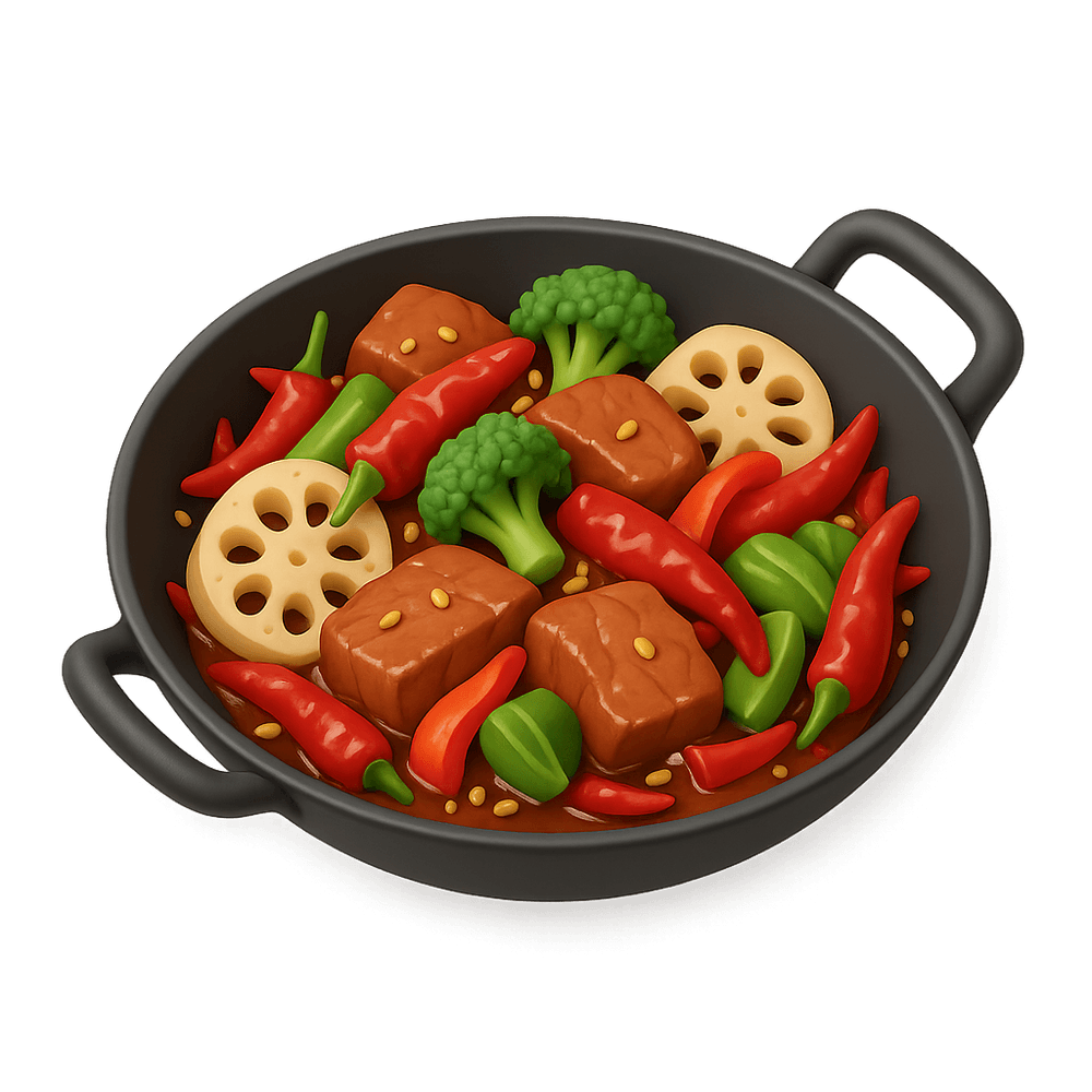 Sichuan Dry Pot is a popular Chinese dish from Sichuan cuisine, featuring a medley of meats, vegetables, and spices stir-fried together in a wok with bold, numbing, and spicy flavors. Unlike hot pot, it is served dry without broth, making it aromatic and intensely flavorful.