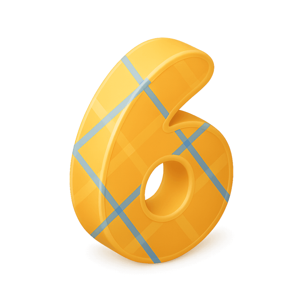 The number six, commonly used as a numeral or symbol in digital and analog interfaces. It represents the value 6 and is often found in clocks, keypads, and user interfaces for selection or identification.