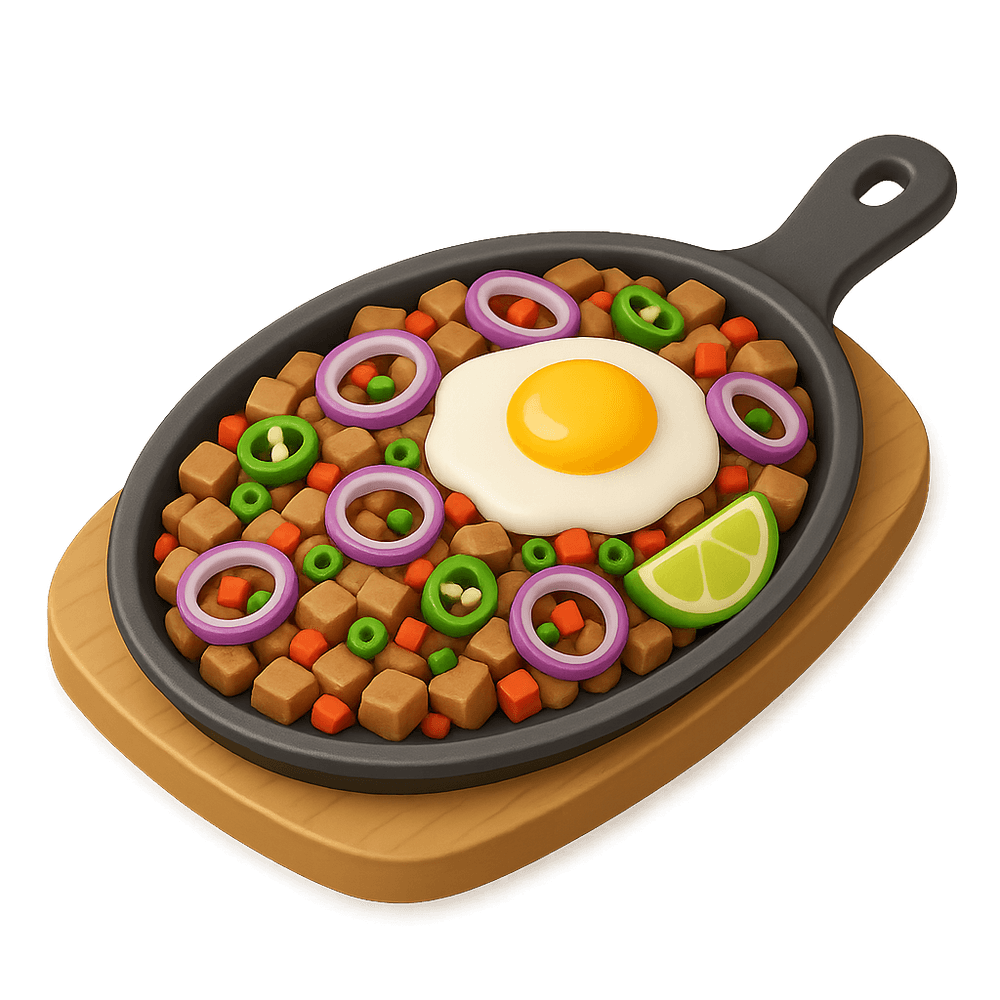 A Filipino dish made from chopped pork, onions, and spices, served on a sizzling hot plate. Known for its savory, tangy, and slightly spicy flavors, it's a popular comfort food and bar snack in the Philippines.