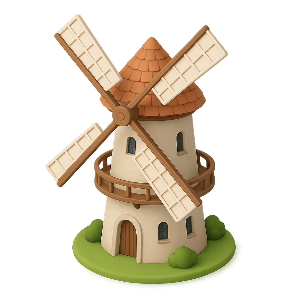 A smockmill is a type of windmill with a sloping, horizontally weatherboarded tower, usually topped with a rotating cap that allows the sails to turn into the wind. Traditionally used for grinding grain or pumping water, smockmills are notable examples of historical rural architecture.