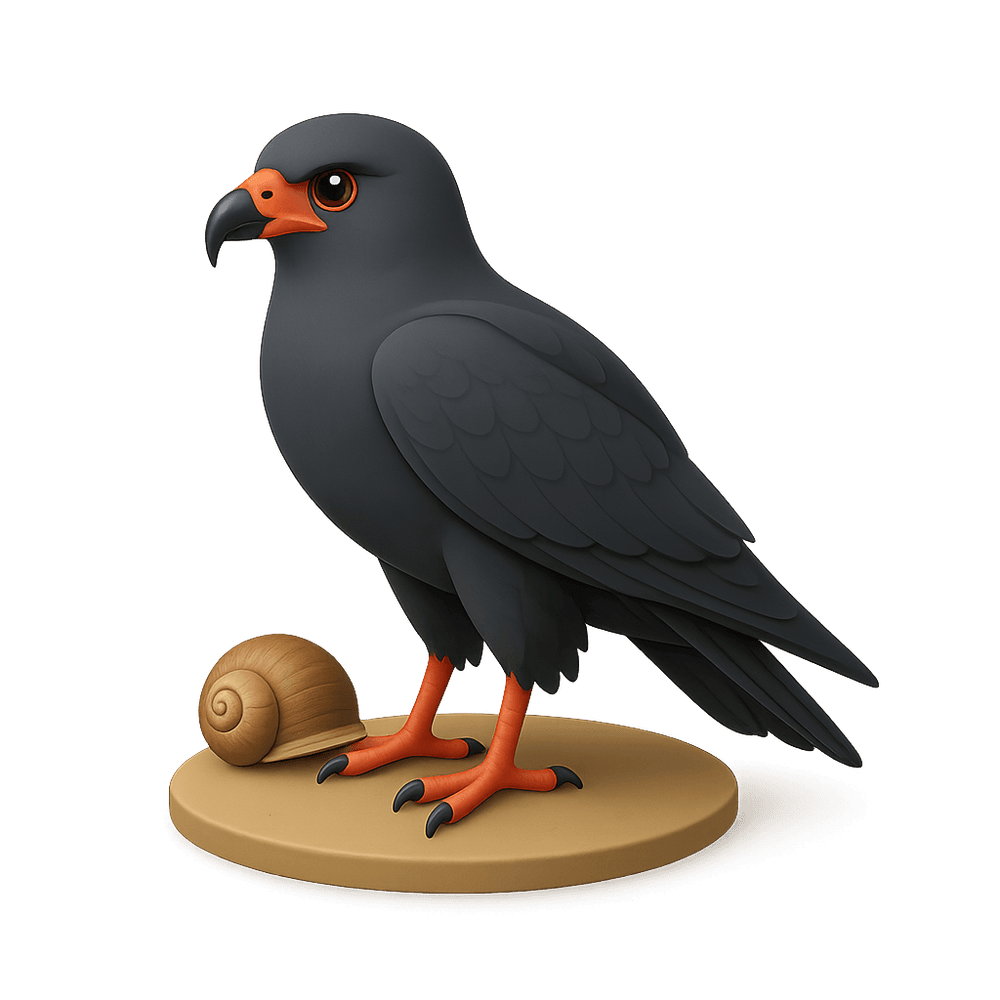 The Snail Kite is a medium-sized raptor found in wetlands of the Americas, known for its distinctive hooked beak adapted for feeding almost exclusively on apple snails. It is recognized for its striking appearance and specialized hunting skills.