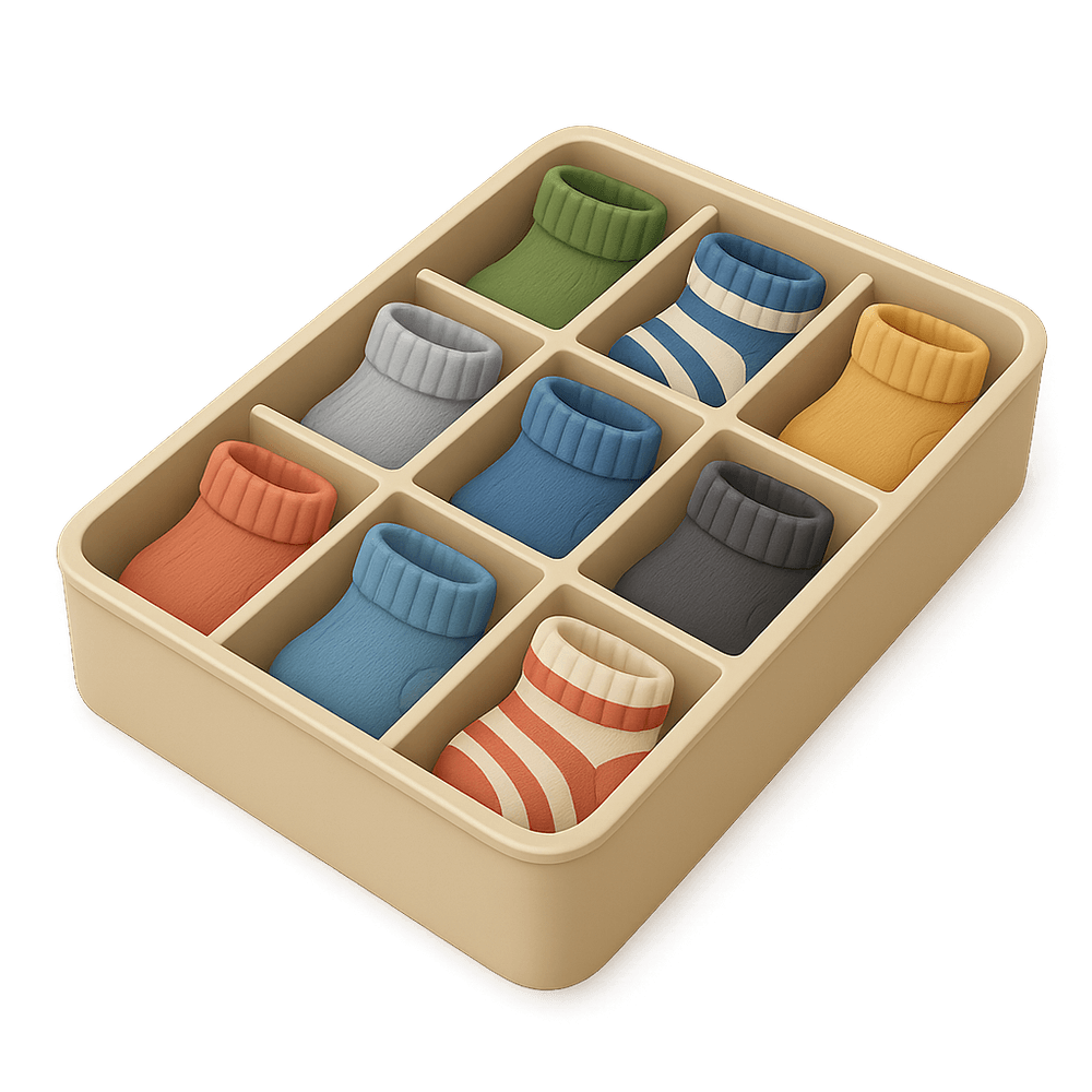 A sock organizer is a storage solution designed to keep socks neatly separated and easy to find. It typically fits inside a drawer and features multiple compartments for organizing pairs of socks, reducing clutter and saving time during daily routines.