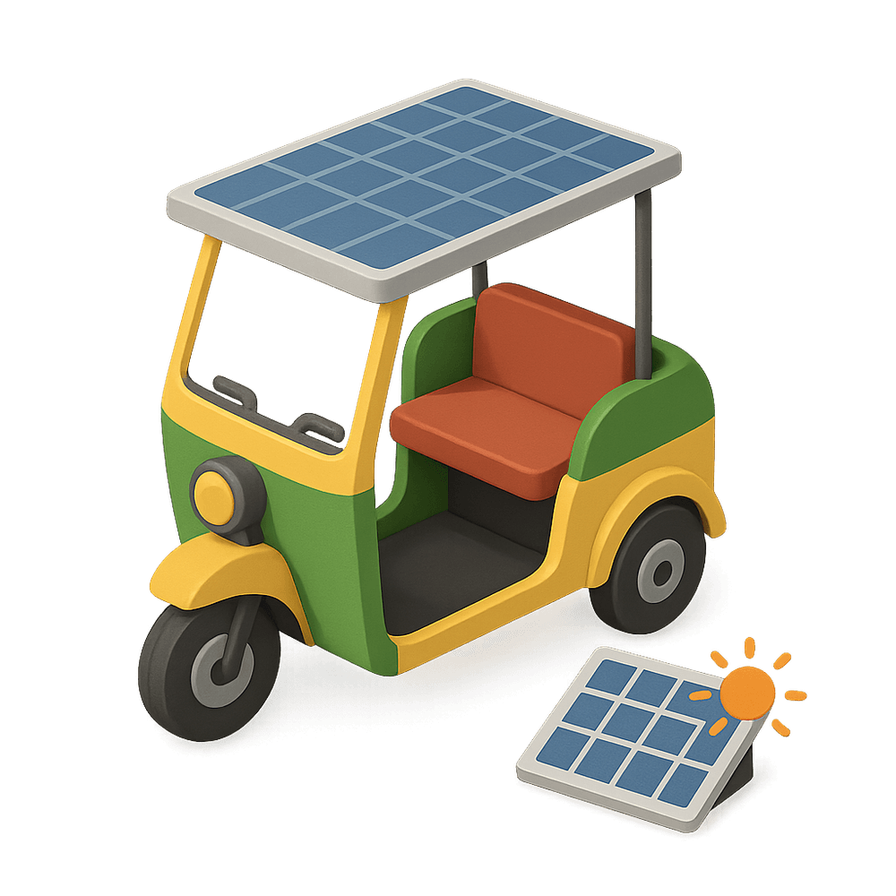 A three-wheeled vehicle commonly used for short-distance urban transport, powered by solar panels mounted on its roof. It offers an eco-friendly alternative to traditional auto-rickshaws, reducing emissions and operating costs.