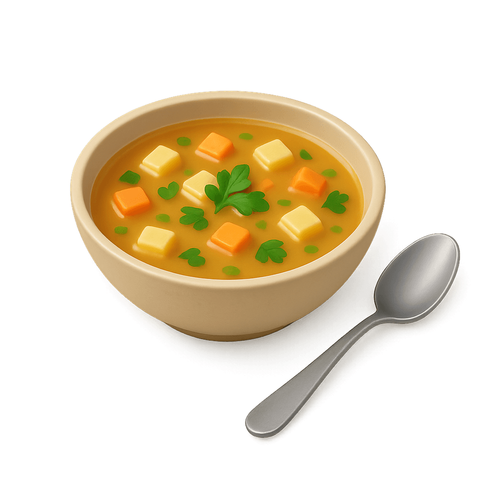 A liquid food typically made by boiling meat, vegetables, or legumes in water or stock. Soup is a basic and versatile dish found in many cultures, often served as a starter or main course.