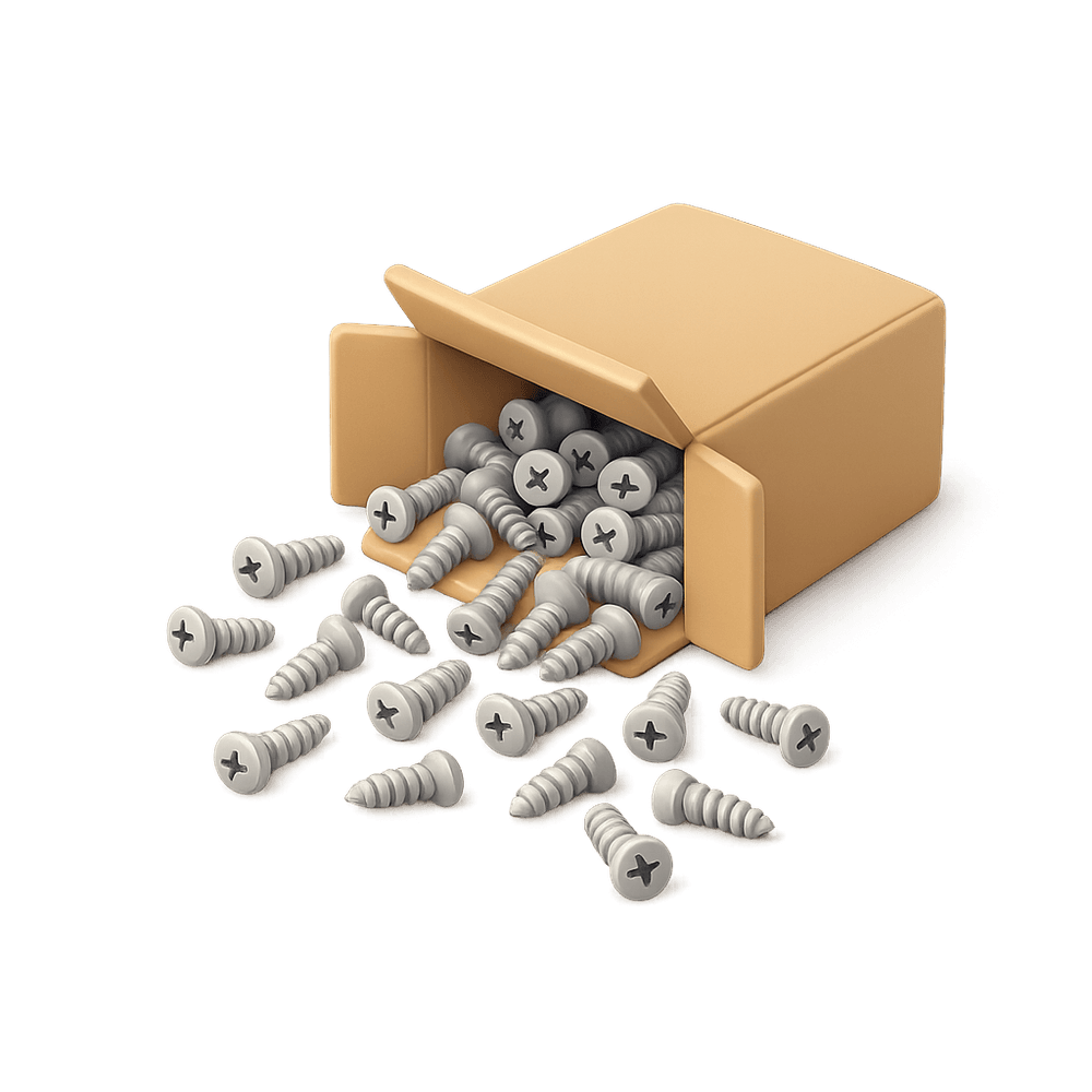A container of screws accidentally tipped over, scattering its contents. Common in workshops and construction sites, it represents a minor workplace mishap and the need for organization.