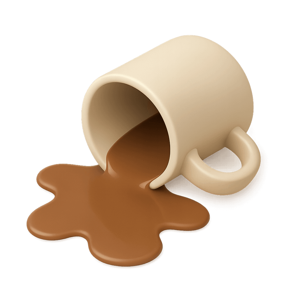A common household mishap where coffee is accidentally knocked over, creating a mess that often requires immediate cleaning. Spilled coffee is a relatable moment in everyday life, symbolizing minor accidents and the need for quick cleanup.