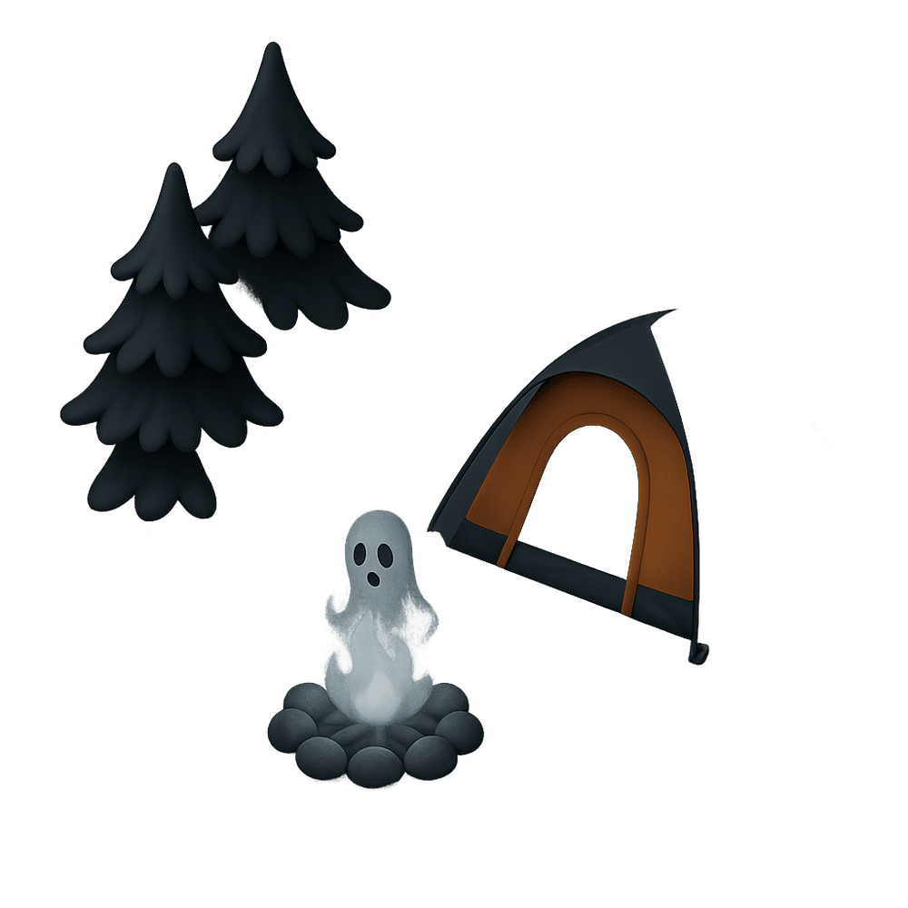 A mysterious and eerie campsite shrouded in fog, where ghostly campfires flicker and strange sounds echo through the night. Perfect for imaginative adventures and spooky storytelling.