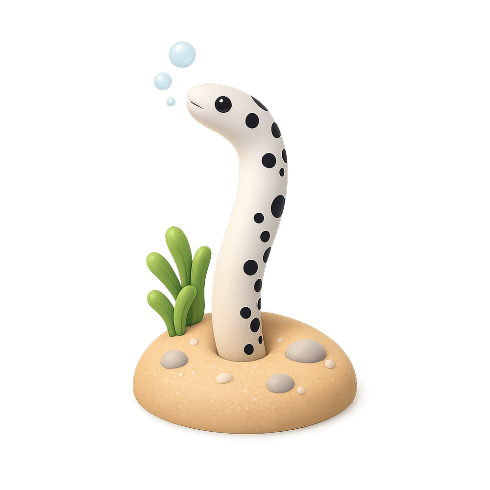 The Spotted Garden Eel is a small, slender marine fish known for its distinctive black spots and habit of living in colonies, partially buried in sandy ocean floors with only their heads protruding. They sway with the current to catch plankton and are commonly found in Indo-Pacific coral reefs.