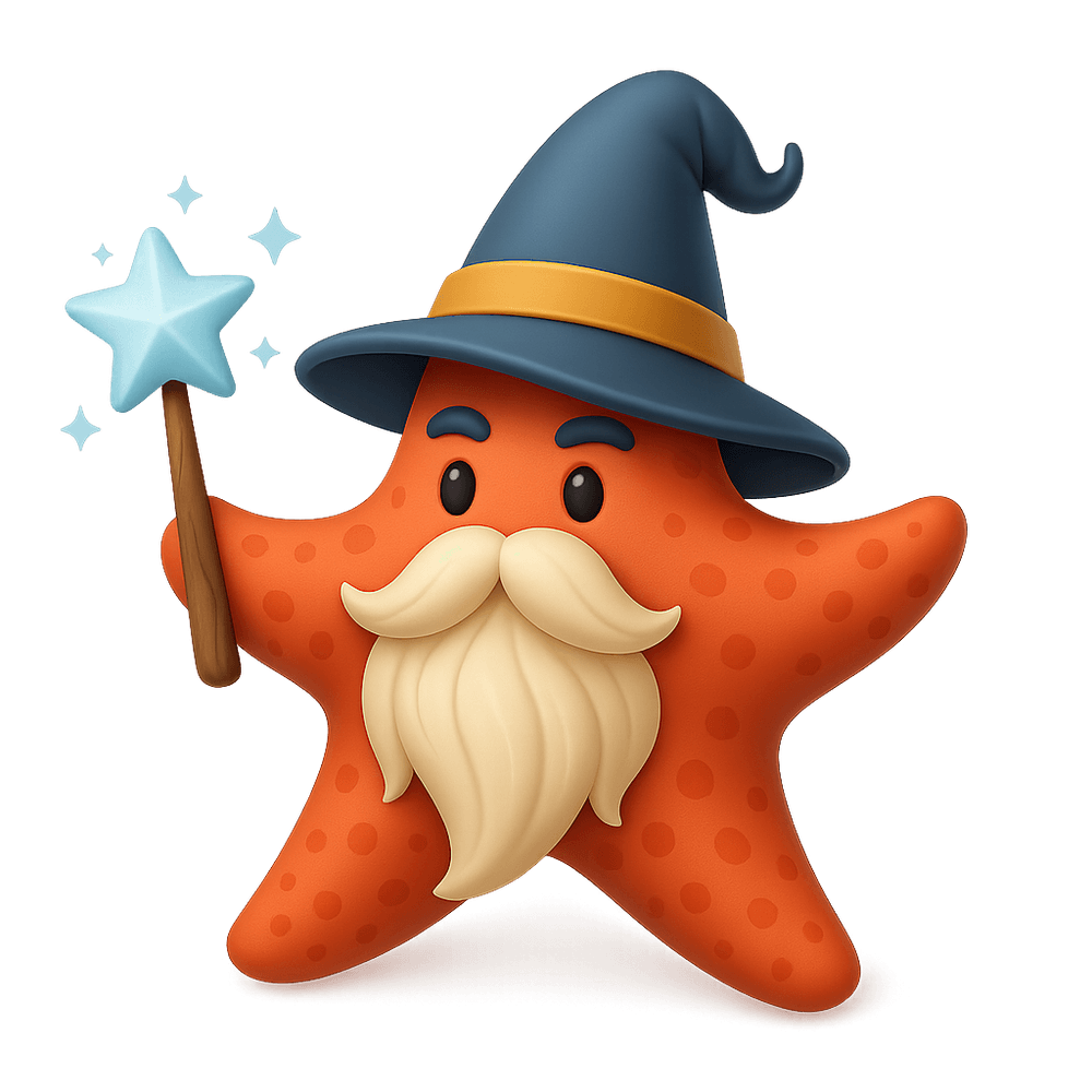 A magical sea creature with the body of a starfish and the wisdom of a wizard, known for casting oceanic spells and guiding lost sailors through enchanted waters.