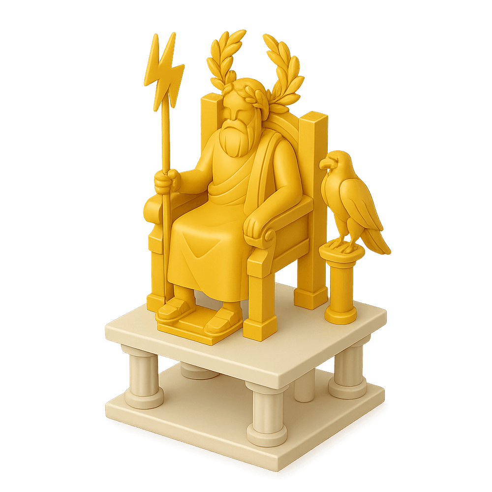 A monumental statue of the Greek god Zeus, created by the sculptor Phidias around 435 BCE, and considered one of the Seven Wonders of the Ancient World. It was located in the Temple of Zeus at Olympia, Greece, and symbolized the power and majesty of the king of the gods in ancient Greek religion.