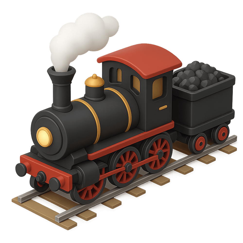 A classic steam-powered locomotive paired with a coal car, used for transporting goods and passengers along railways. Iconic for its historical significance in industrial transport and travel.