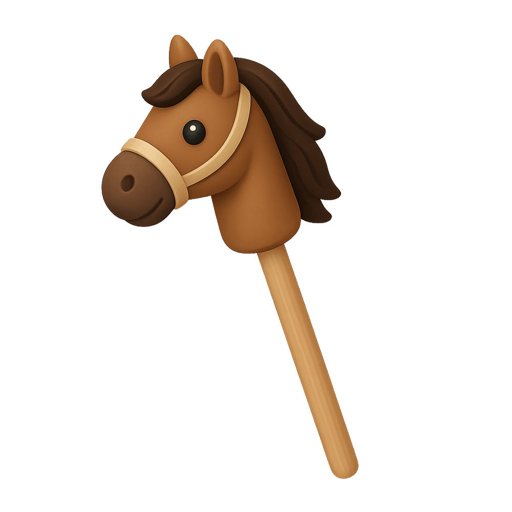 A stick horse is a simple toy consisting of a long stick with a horse's head, often made of fabric or wood, attached to one end. Children use it to pretend they are riding a horse, making it popular for imaginative play and physical activity.