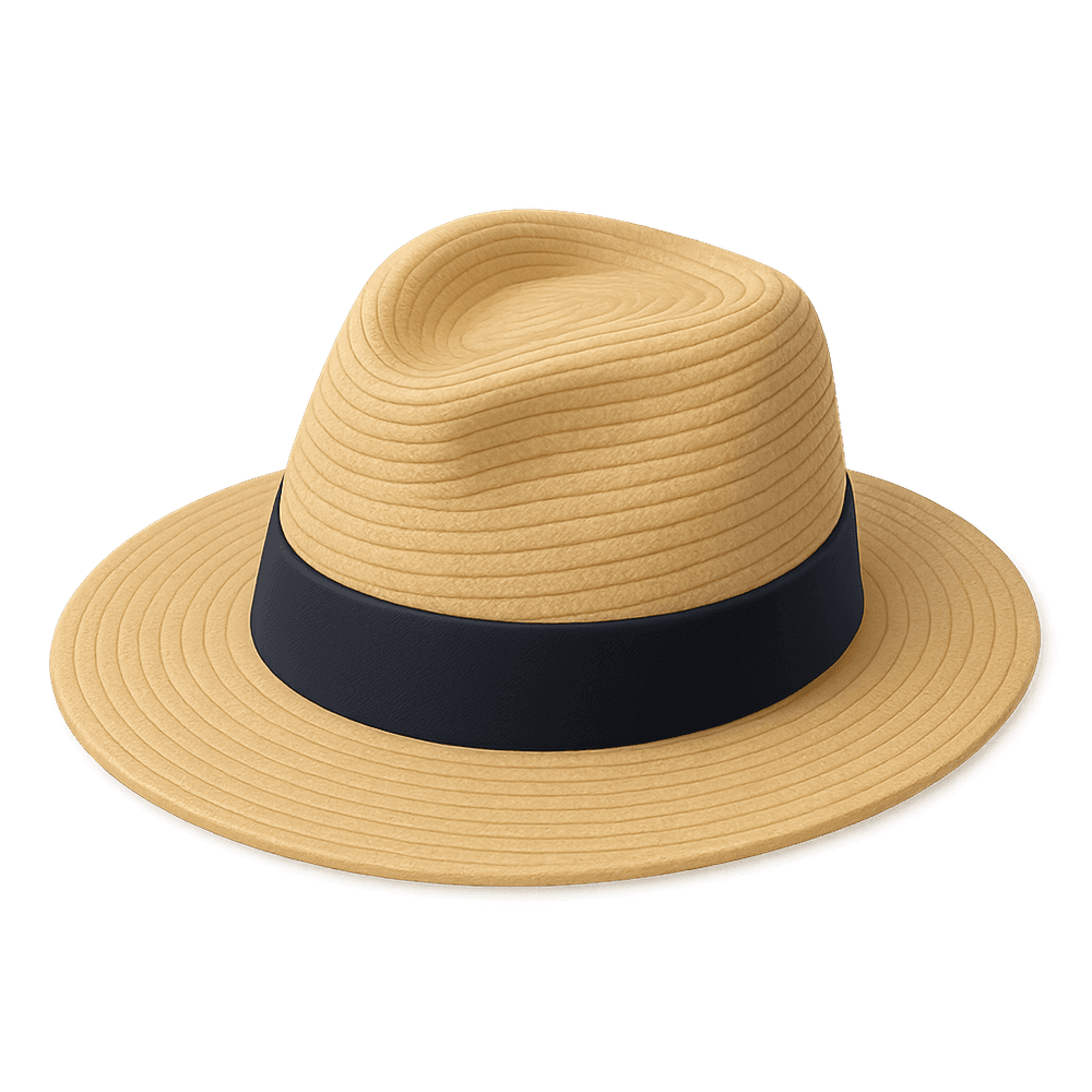 A lightweight hat woven from straw or similar materials, typically worn in warm weather for sun protection and as a stylish accessory. Popular in casual and summer fashion.