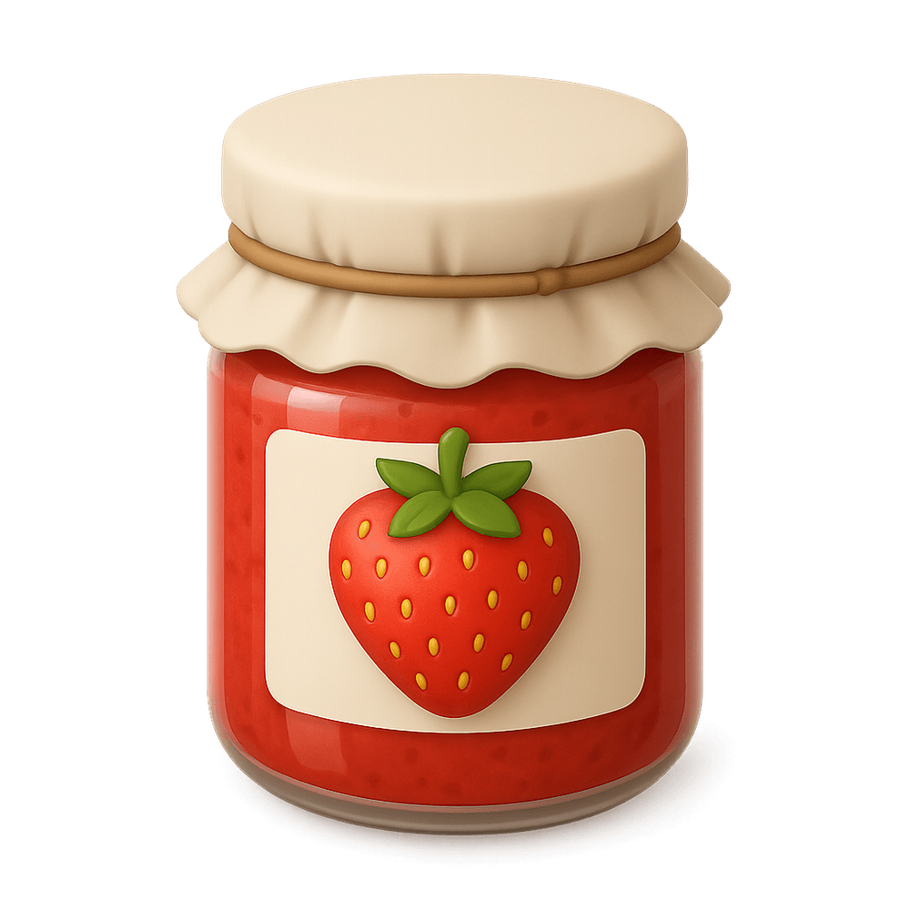 A sweet spread made from strawberries, sugar, and pectin, commonly used on bread, toast, or as a dessert ingredient. Known for its fruity flavor and vibrant red color.