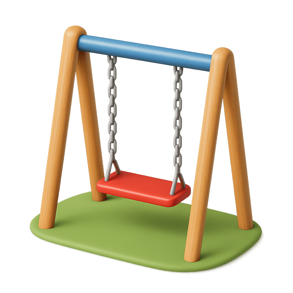 A swing is a basic playground equipment consisting of a seat suspended by ropes or chains, allowing a person to move back and forth for recreation and enjoyment. Swings are commonly found in parks, playgrounds, and backyards, providing entertainment and leisure for children and adults alike.