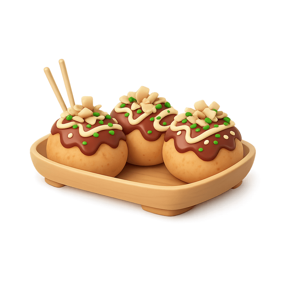 Takoyaki is a popular Japanese street food made of wheat flour batter filled with diced octopus, tempura scraps, pickled ginger, and green onion, cooked in a special molded pan and topped with savory sauces and bonito flakes.