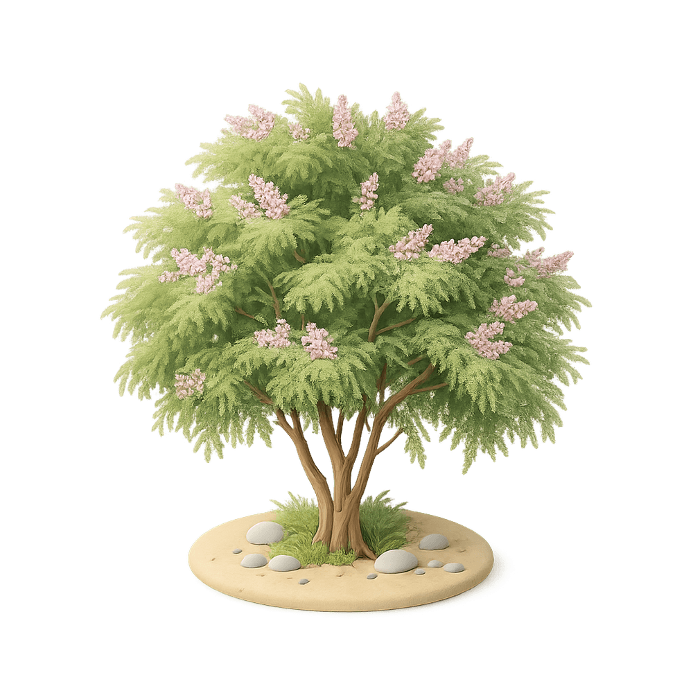 The Tamarisk tree is a hardy, salt-tolerant shrub or small tree known for its feathery foliage and pink or white flowers. Often found in arid and semi-arid regions, it plays a role in stabilizing soil and providing habitat for wildlife.