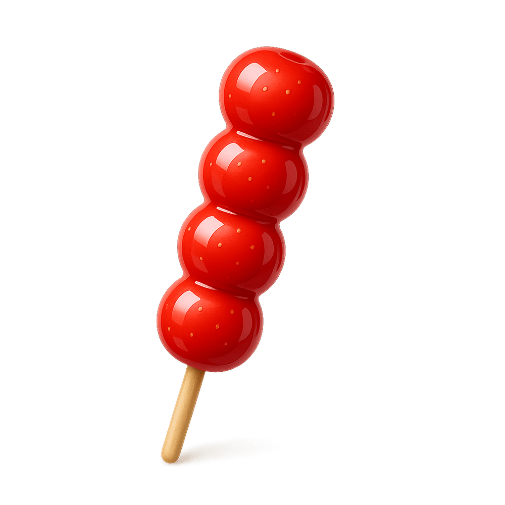 Tanghulu is a traditional Chinese snack consisting of skewered fruits, typically hawthorn berries, coated in a hard, shiny sugar syrup. It is popular street food, especially in northern China, and is known for its sweet and tangy flavor and crunchy texture.