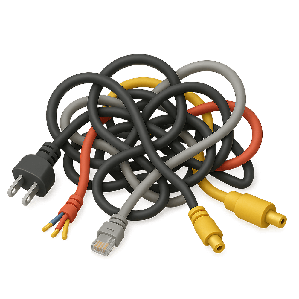 A chaotic bundle of electrical wires, often found behind desks or entertainment centers, making organization and identification difficult. Common in everyday life, it represents clutter and the challenges of managing modern technology.