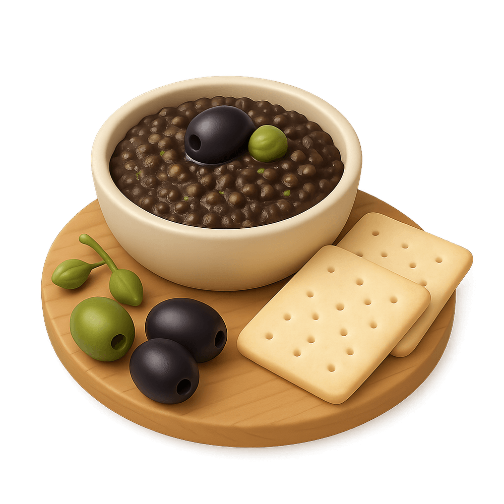 Tapenade is a savory spread or dip from the Provence region of France, made primarily from finely chopped olives, capers, anchovies, and olive oil. It is commonly served as an appetizer with bread or crackers.