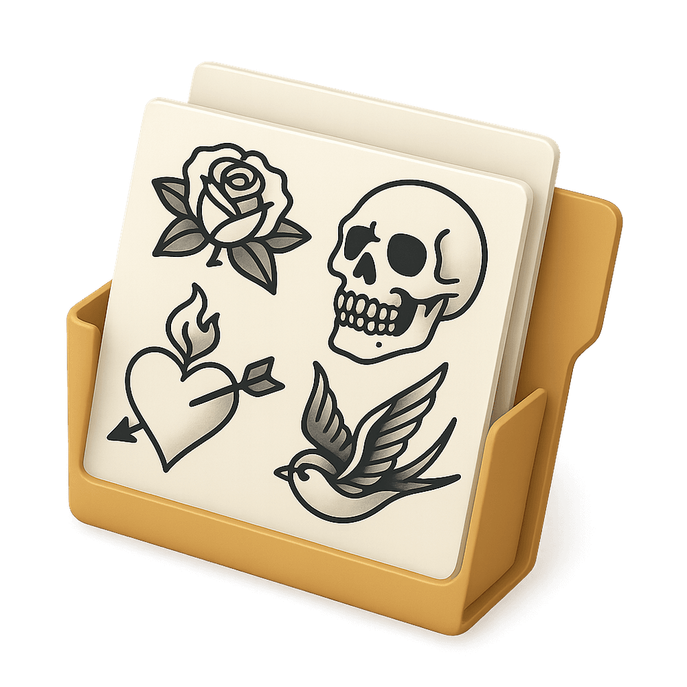 A Tattoo Flash Folder is a collection of printed sheets featuring tattoo designs, used by tattoo artists to showcase their artwork to clients and for inspiration. Commonly found in tattoo studios, these folders help organize and present a variety of design options.